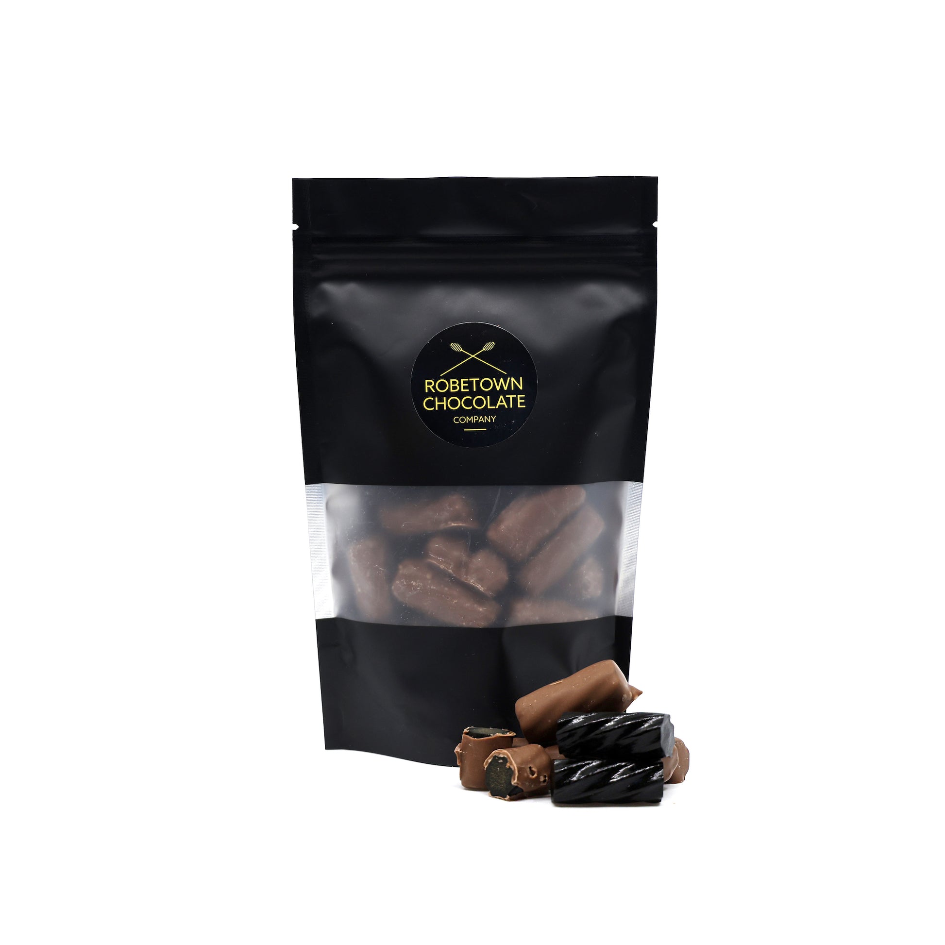 Milk chocolate coated soft eating licorice twist shape pieces.