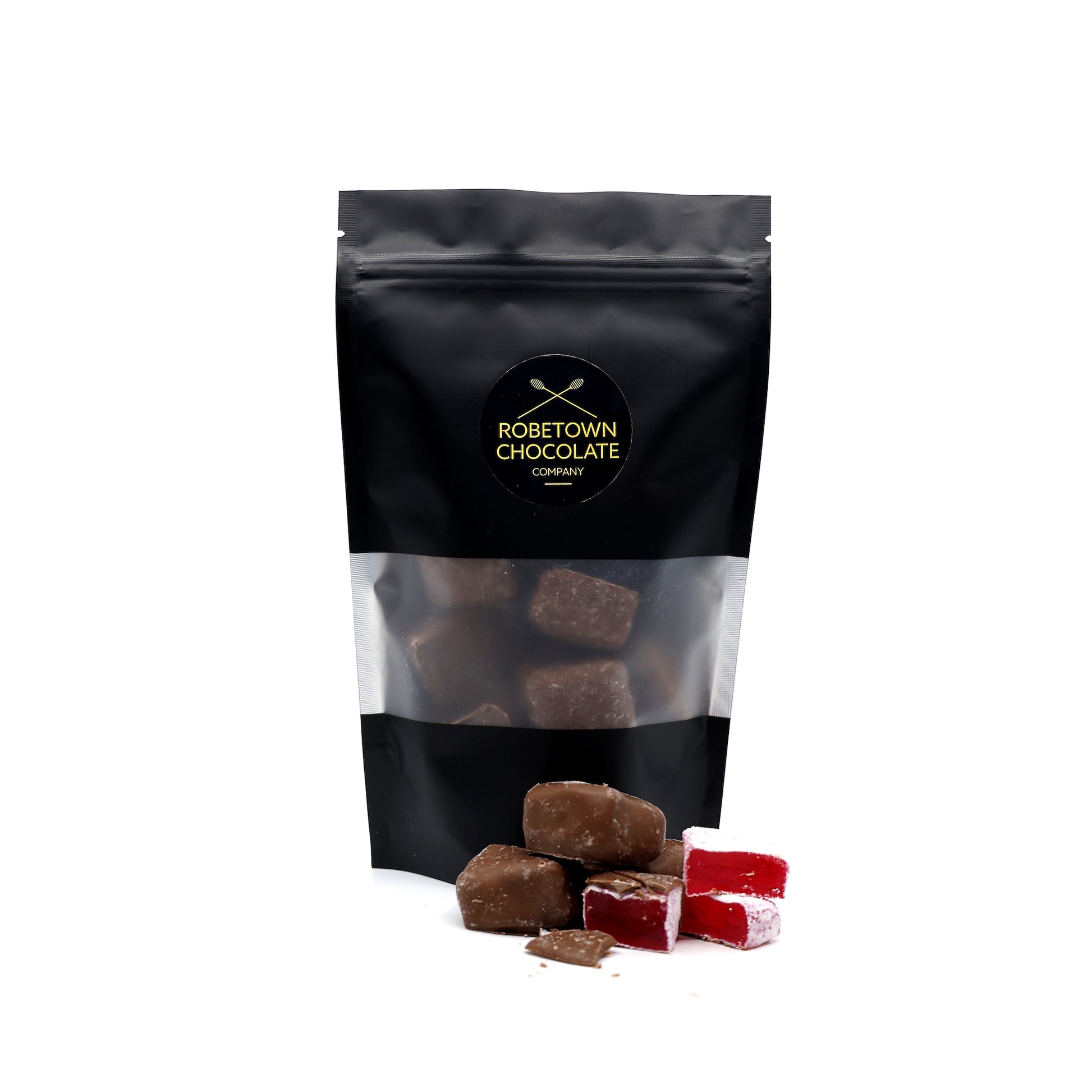 Ingredients: Sugar, Milk Chocolate (Sugar, Milk Powder, Cocoa Butter, Cocoa Mass, Emulsifier (Soy Lecithin), Flavour), Glucose, Water, Pectin, Food Acid (330), Acidity Regulator (331), Rose Flavour (0.08), Raspberry Flavour, Colour (122). Milk Chocolate contains 34% Cocoa Solids and 24% Milk Solids